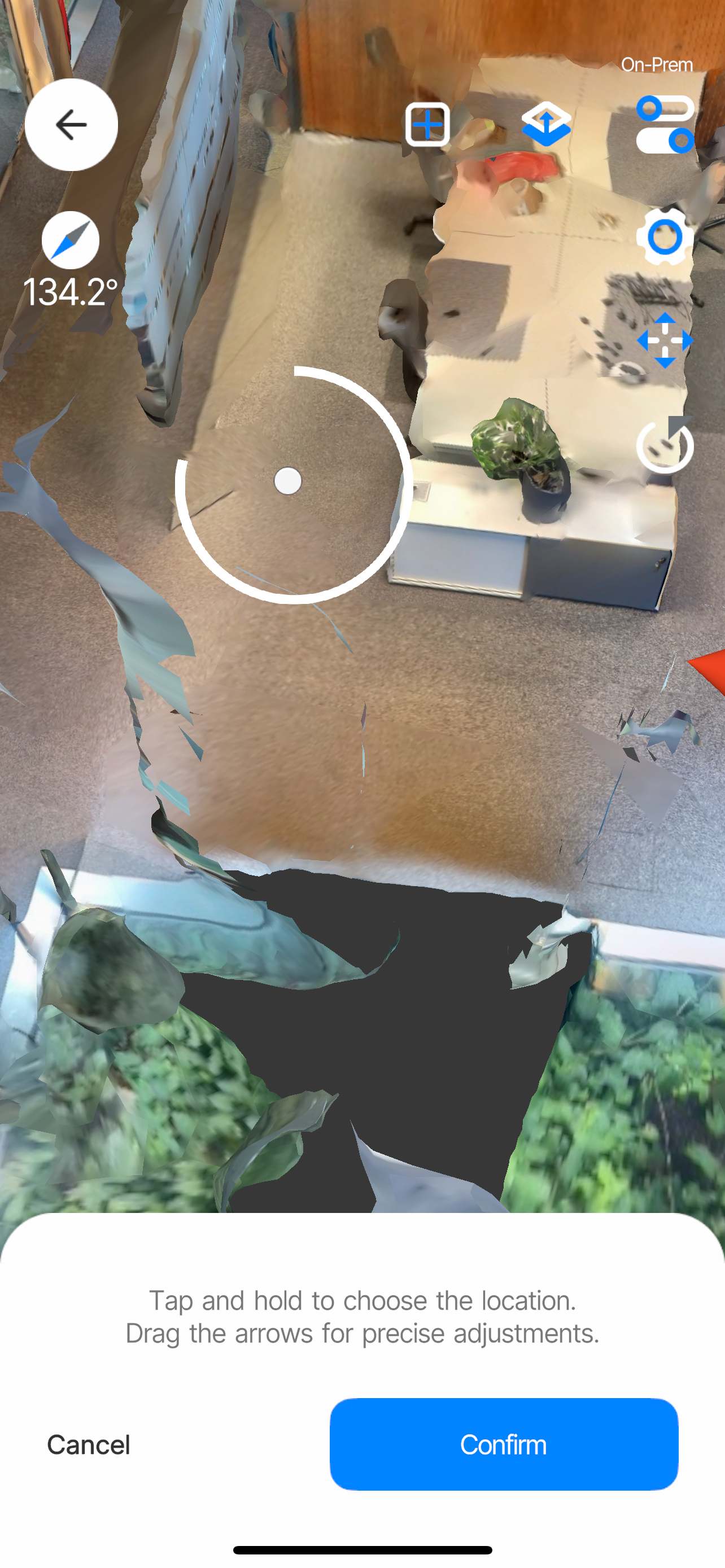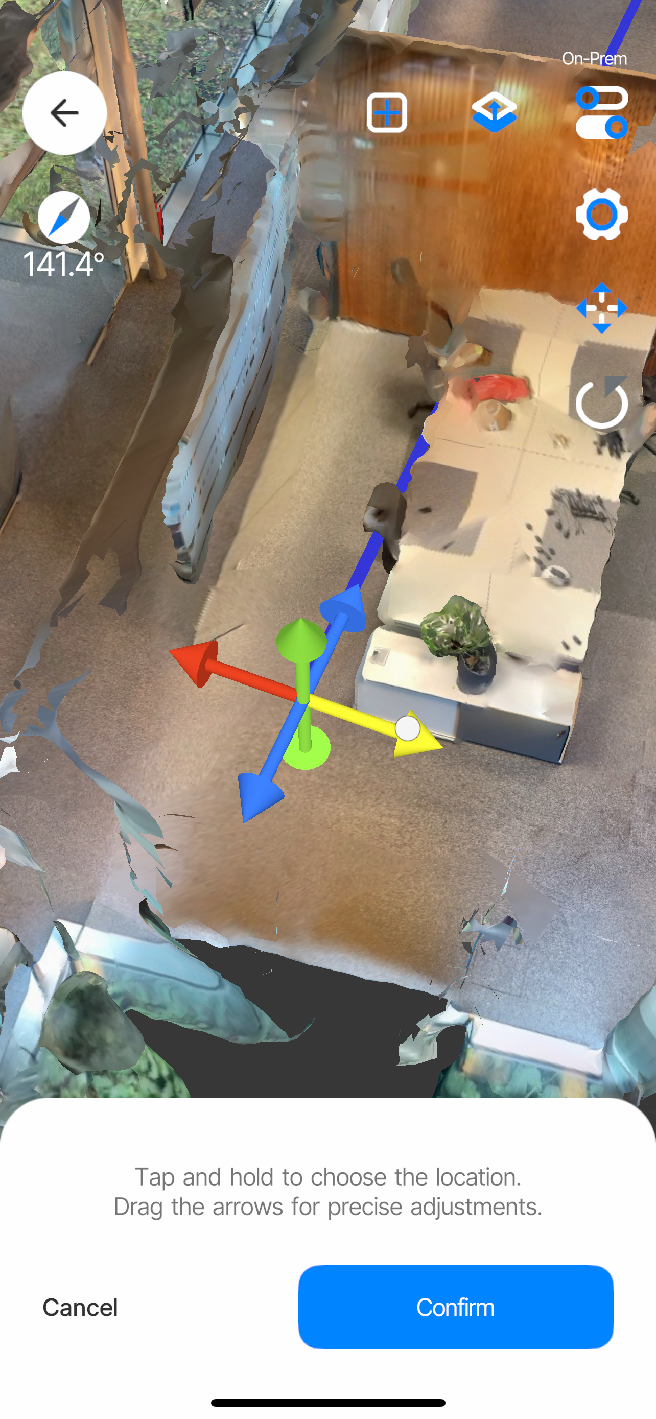 For environments using the AR Navigation app it is necessary to align the y-axis indicated by the blue line with magnetic north. To achieve this you can use the compass displayed in the top left corner of your screen to find the north direction of your environment and adjusting the origin by dragging the rotation gizmo so your model aligns with it as well as possible.